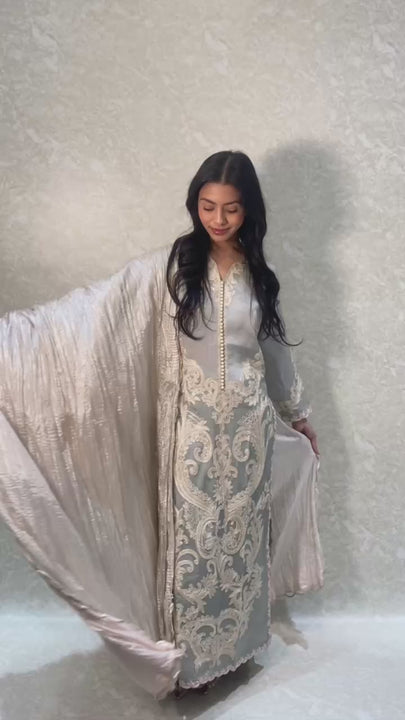 - Stunning 3 piece satin long kameez with contrast embroidery and plazzo suit.