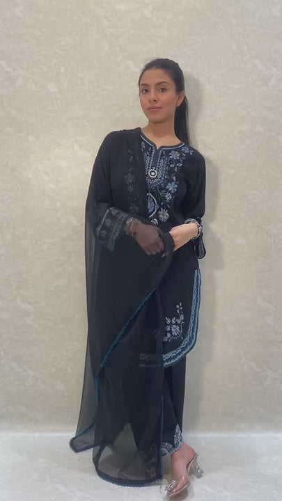 - Stunning 3 piece contrast thread embroidered kameez and farshi salwar suit.