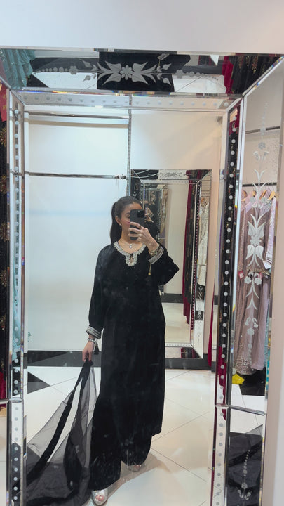 - Stunning 3 piece long velvet kameez and plazzo suit. Silver embellishment on neckline and border on sleeves