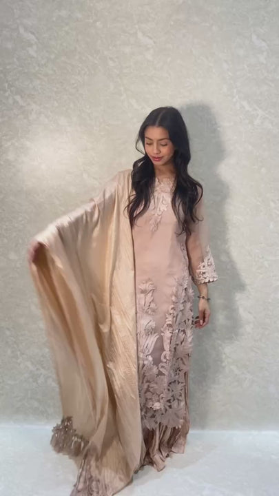 - Stunning 3 piece long double layer kameez with cut work and embroidery and crinkled sharara suit.