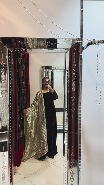 - Stunning 3 piece long velvet kameez and plazzo suit. Paired with a beautiful gold sequins dupatta