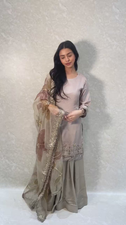 - Stunning 3 piece satin kameez with hand embroidery and flowy satin sharara suit.