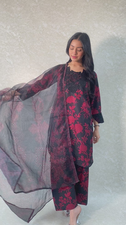 - Stunning 3 piece printed long kameez and farshi salwar suit.